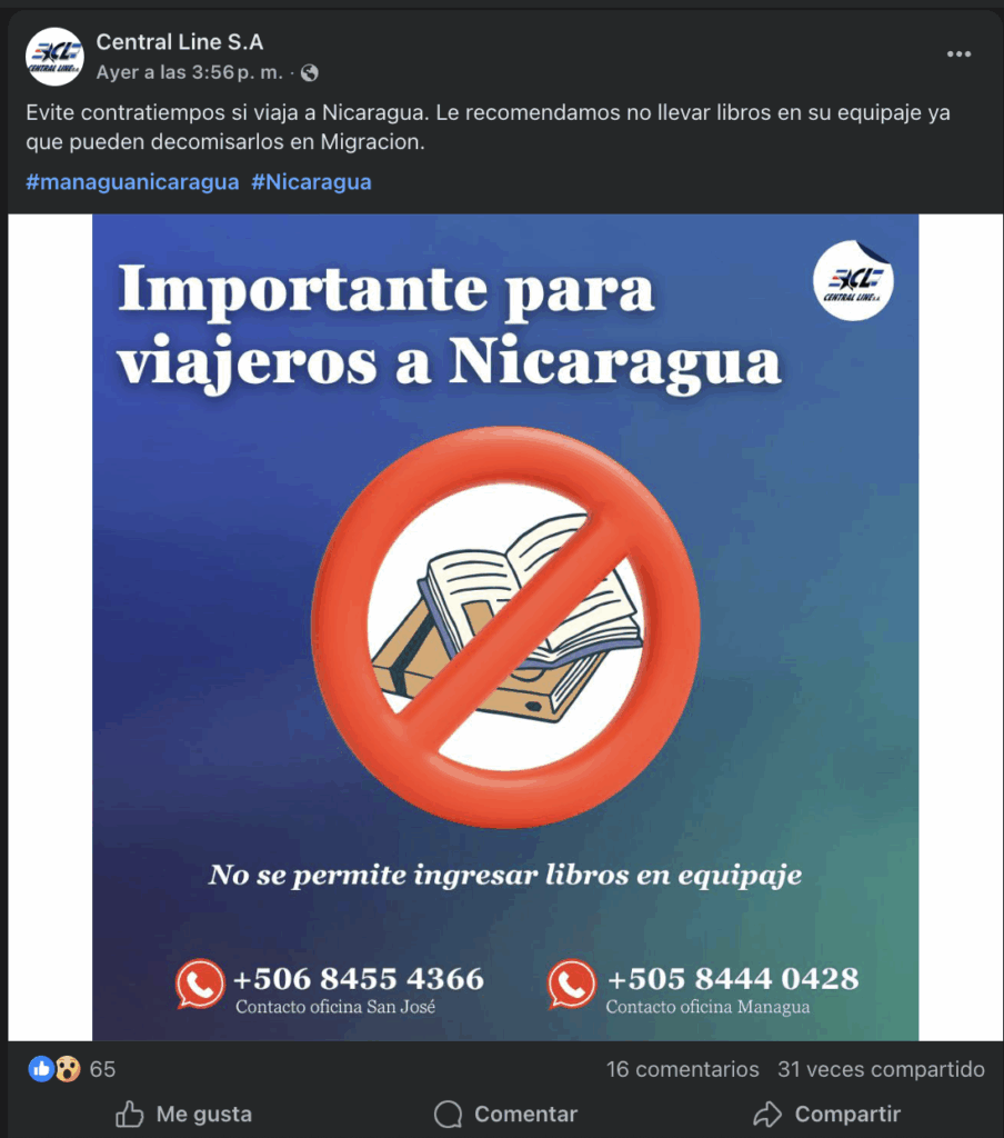 La advertencia fue publicada por la empresa en su página oficial de Facebook, con el objetivo de prevenir contratiempos a sus usuarios. El comunicado textualmente indica: «Evite contratiempos si viaja a Nicaragua. Le recomendamos no llevar libros en su equipaje ya que pueden decomisarlos en Migración».